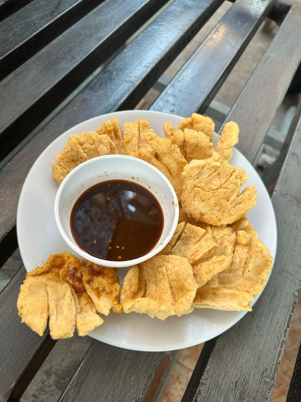 Pempek ikan berbentuk bulat dan tipis, di goreng garing sampai krispy